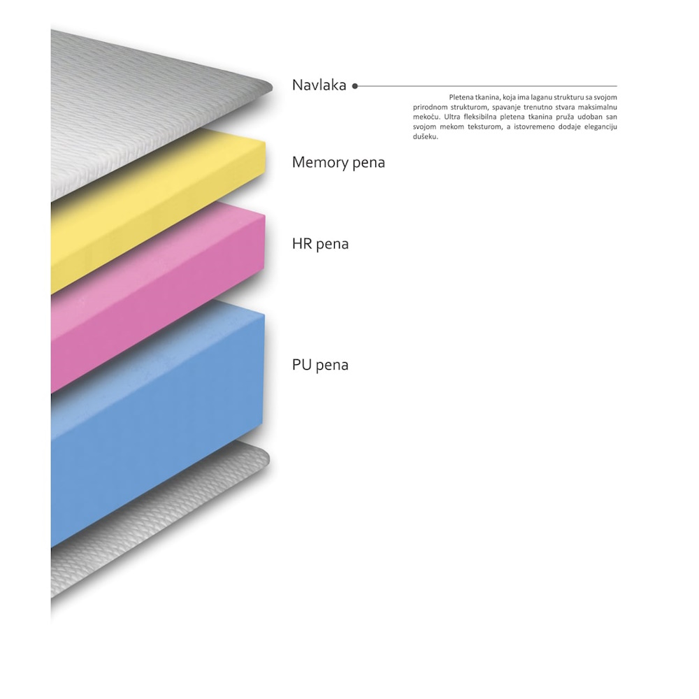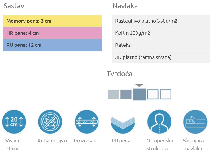 Dostupne standardne dimenzije: 90×200, 120×200, 140×200, 160×190, 160×200, 180×200. Visina je 20cm.
