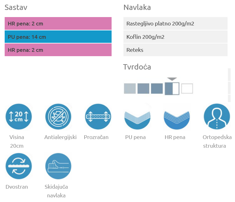 Dostupne standardne dimenzije: 90×200, 120×200, 140×200, 160×190, 160×200, 180×200. Visina je 20cm.