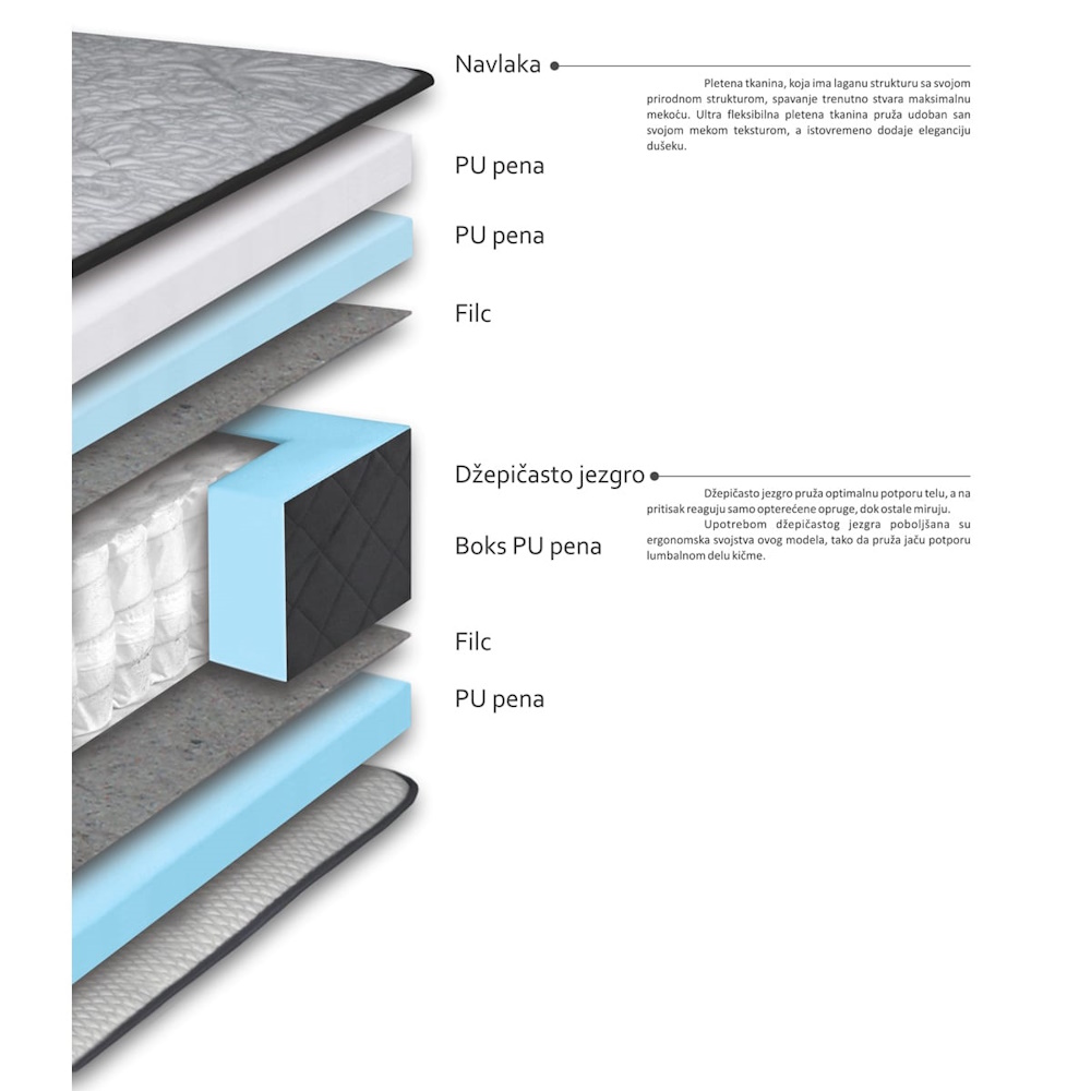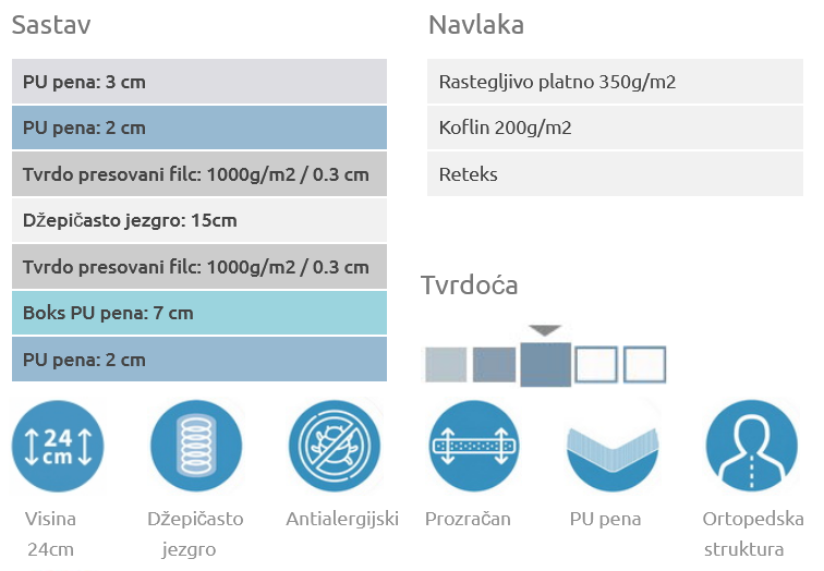 Dostupne standardne dimenzije: 90×200, 120×200, 140×200, 160×190, 160×200, 180×200. Visina je 24cm.