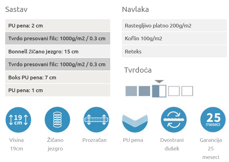 Dostupne standardne dimenzije: 90×200, 120×200, 140×200, 160×190, 160×200, 180×200. Visina je 19cm.