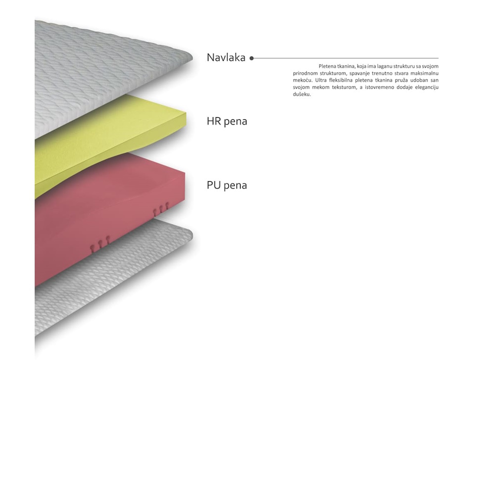 Dušek „HR Double“ je upotrebom HR pene posebno profilisane sa jedne i PU pene takođe profilisane sa druge strane, proizveden da bismo zadovolji vašu potrebu za dobrim snom. Dušeci od HR pene zadržavaju elastičnost i udobnost i nakon višegodisnje upotrebe. HR penu čine ćelije otvorenog tipa koje omogućavaju bolji protok vazduha, zbog zbog su dušeci proizvedeni od HR pene dugotrajniji.
