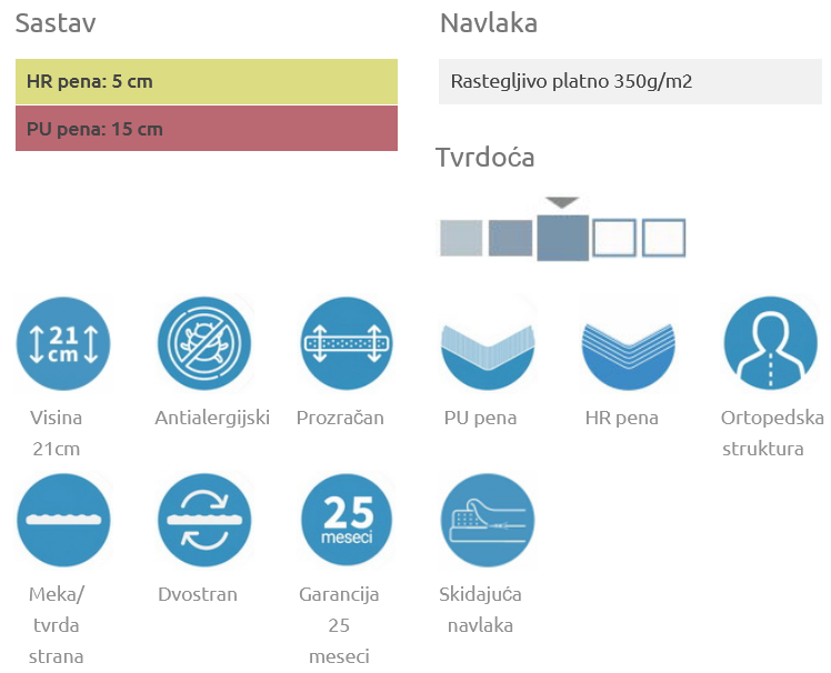Dostupne standardne dimenzije: 90×200, 120×200, 140×200, 160×190, 160×200, 180×200. Visina je 21cm.