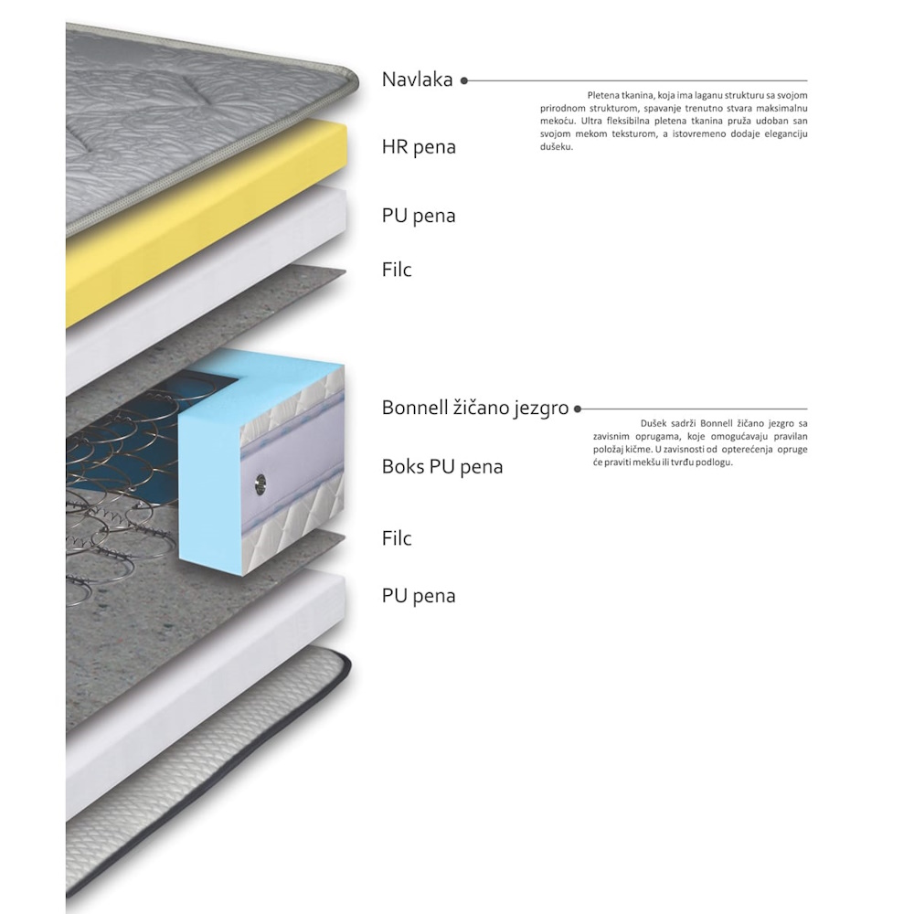 Dušek „Orthopedic“ je dušek koji u sebi sadrži HR penu i pruza izuzetnu udobnost i trajnost. Pružiće Vam osećaj nežnog dodira prirodnog punjenja na elastičnoj podlozi bonnel žičanog jezgra.