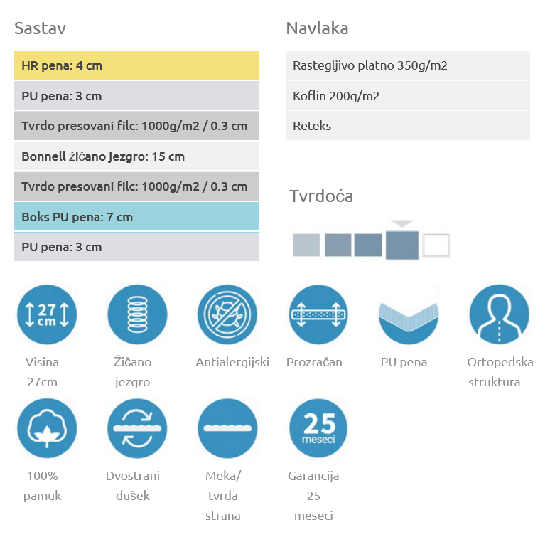 Dostupne standardne dimenzije: 90×200, 120×200, 140×200, 160×190, 160×200, 180×200. Visina je 27cm.