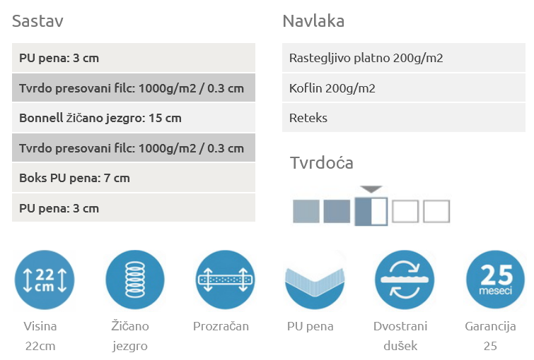 Dostupne standardne dimenzije: 90×200, 120×200, 140×200, 160×190, 160×200, 180×200. Visina je 22cm.