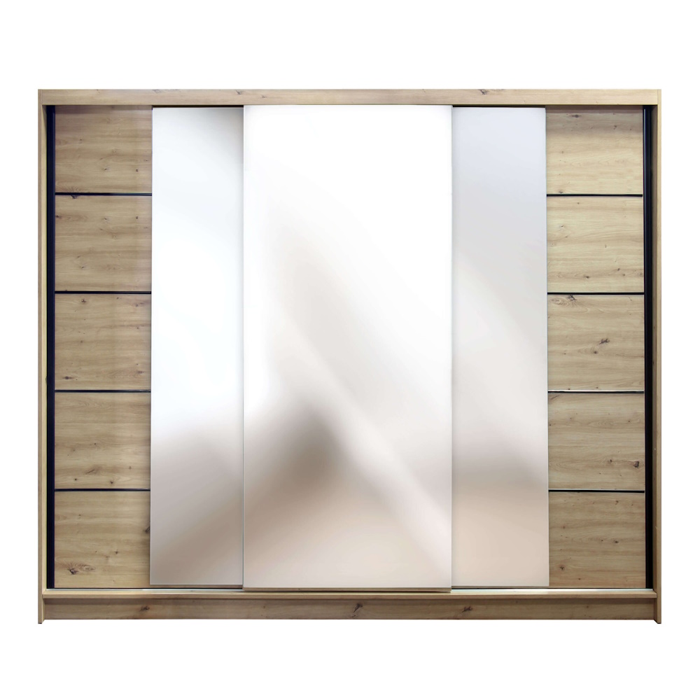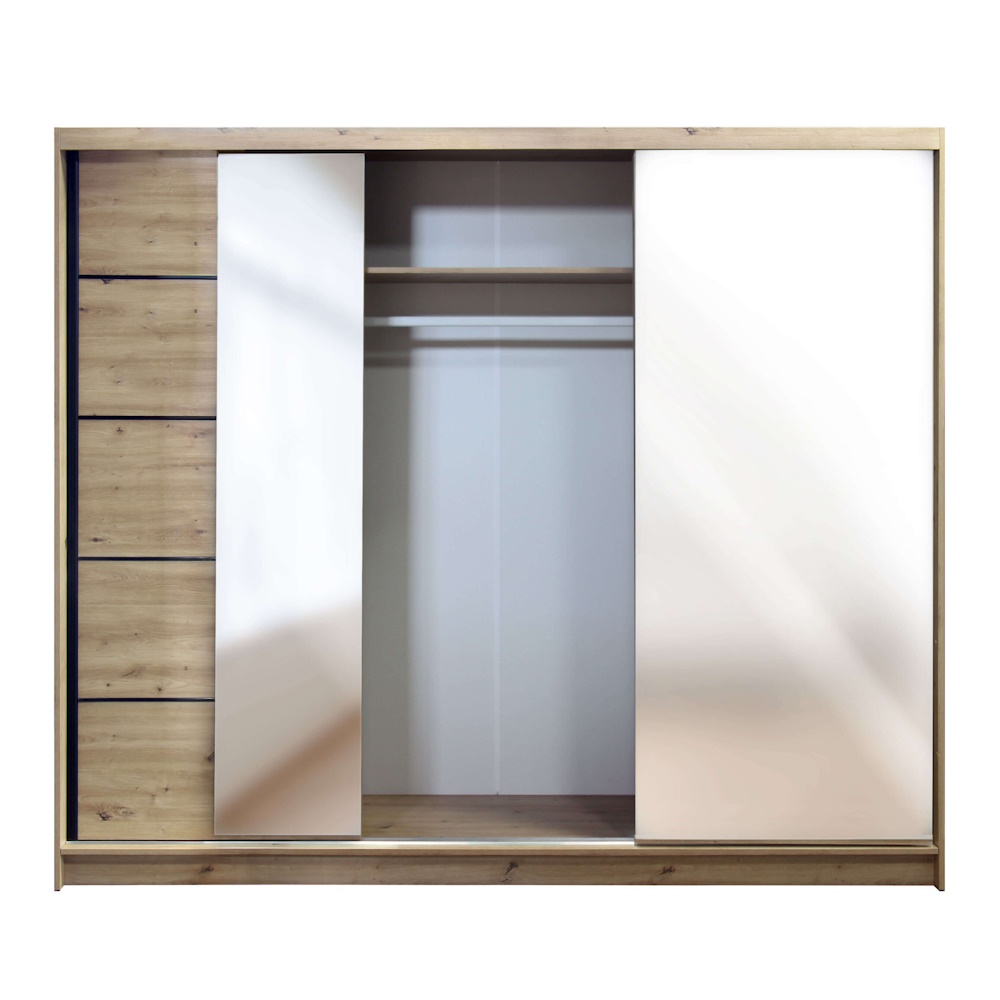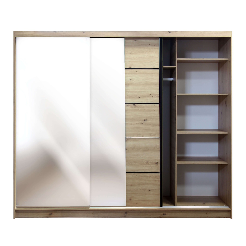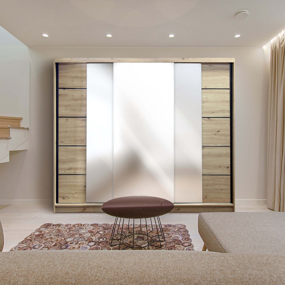 Klizni plakar „Davos“ sa ogledalom 250 je sofisticirani element dizajna koji spaja stil i funkcionalnost. Ovaj široki klizni ormar sa prirodnim drvenim dekorom i elegantnim ogledalnim vratima čini svaki prostor vizuelno većim i svetlijim. Unutar plakara nalazi se obilje prostora za odlaganje, uključujući velike police i šipku za vešanje, savršeno organizovane za laku upotrebu i preglednost. Idealno rešenje za one koji traže kombinaciju moderne estetike i praktičnosti.