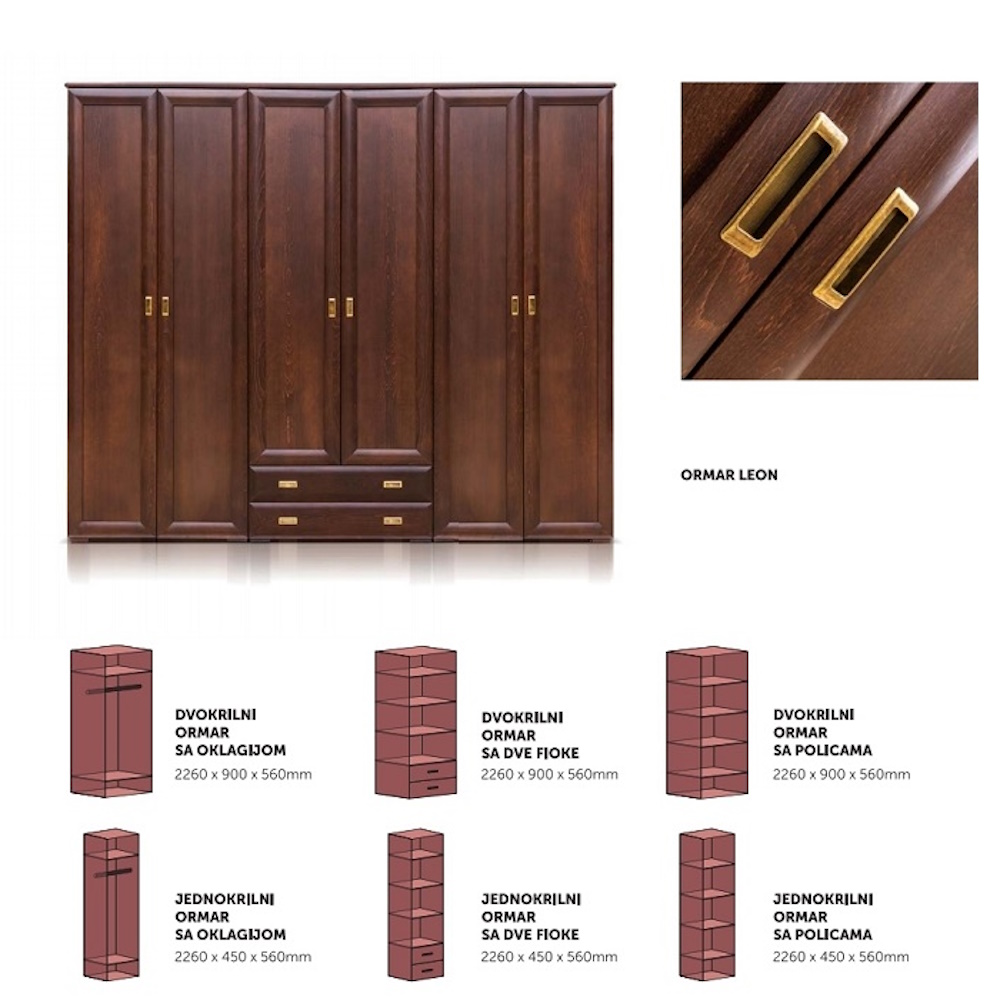 U istaknutu cenu uračunati su dva dvokrilna ormara Leon sa oklagijom i jedan dvokrilni ormar Leon sa dve fioke, ukupne dimenzije 270 x 56 x 2226