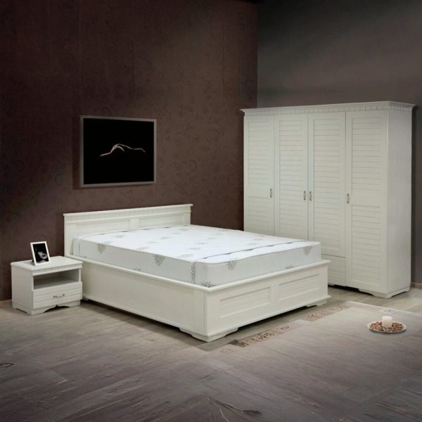 Spavaca soba „Leon“ sa krilima modernog dizajna i integrisanim ručicama, izrađena u kombinaciji masiva i medijapana, veliki izbor dezena po Vašem izboru.