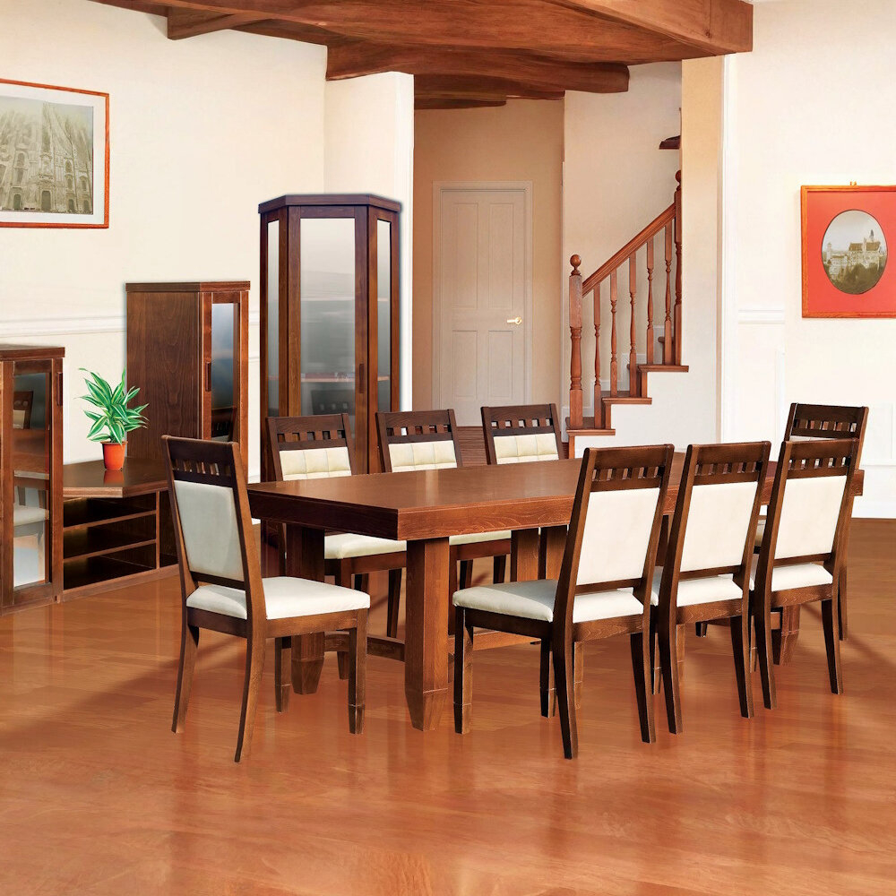 Trpezarijski sto „Danon“ ima fiksne dimenzije i elegantan dizajn, što ga čini savršenim dodatkom za svaku trpezariju. Izrađen je od kombinacije bukovog masiva i furniranog MDF-a, što mu daje čvrstoću i estetski privlačan izgled.