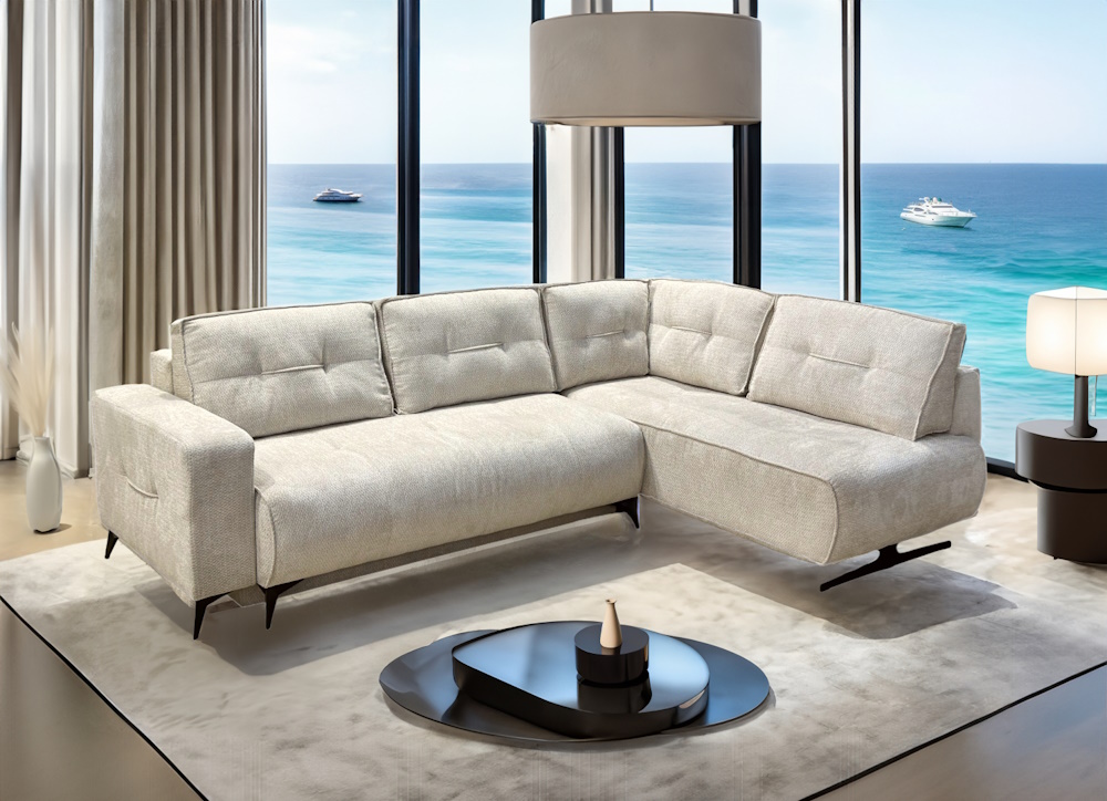 Ugaona garnitura „Bosfor“ je elegantna, prostrana i udobna, idealna za veće dnevne boravke. Karakteriše je moderan dizajn sa naglašenim, širokim rukonaslonima i mekim, dubokim sedištima. Dostupna je u različitim materijalima i bojama, što omogućava uklapanje u svaki enterijer.