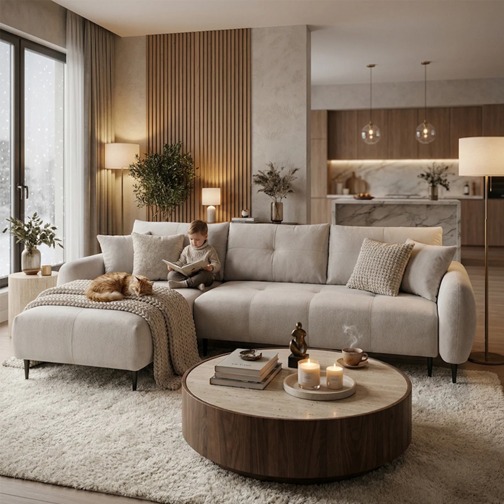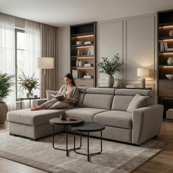 Ugaona garnitura „Cosmos“ je dizajnirana za ljubitelje lepih komada nameštaja. Zaobljene ivice,nežni šavovi i elegantne stope inspirisane načelima minimalističkog dizajna, daju mu suptilni izgled pretvarajući prosečan neutralni ambijent u otmeni kutak za druženje i odmor.
