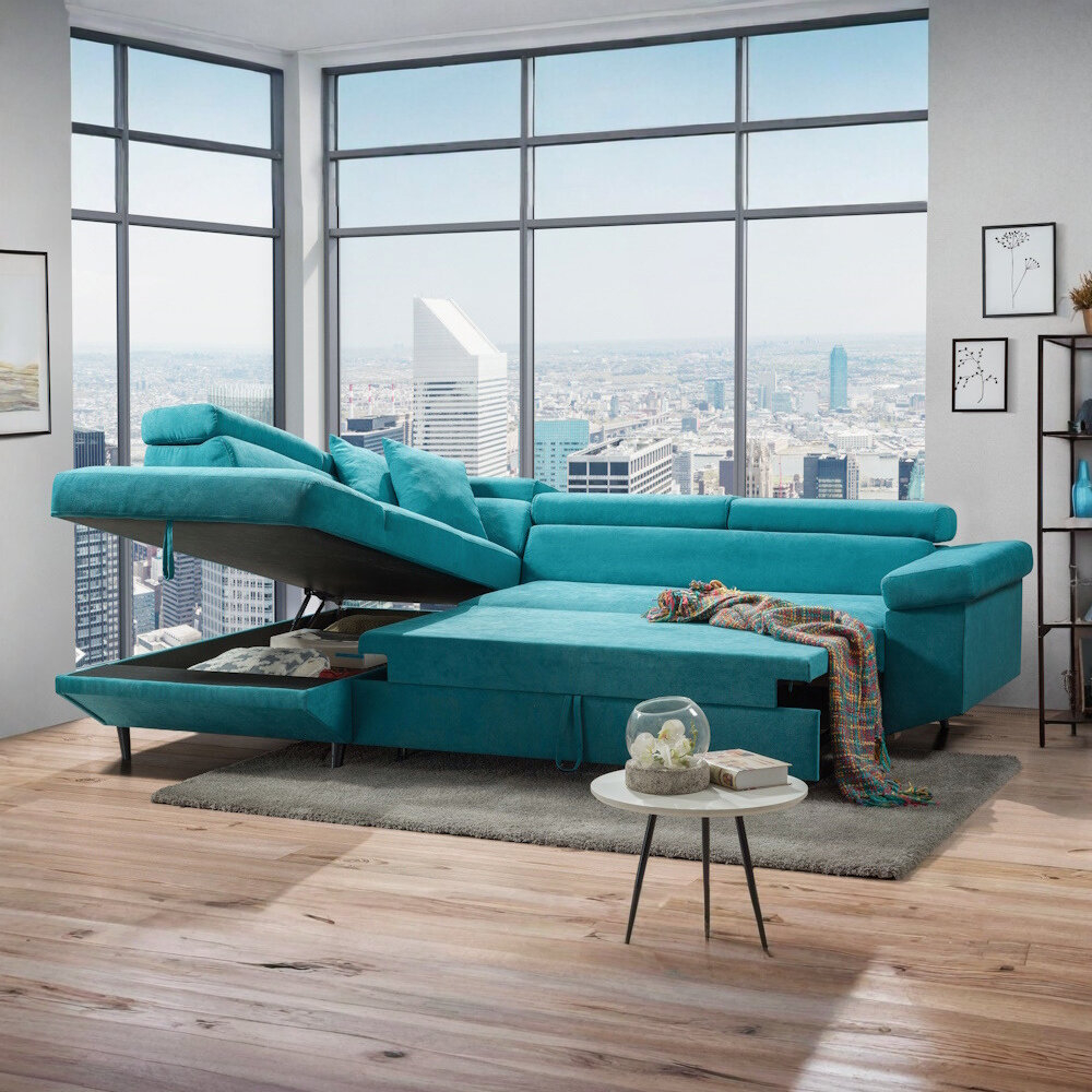 Dodatne informacije: val opruga, visoko elastična HR pena, lako konvertibilan u prostran ležaj, prostor za odlaganje, izbor ugla levo/desno, izbor štofa, podešavajući glavonasloni.